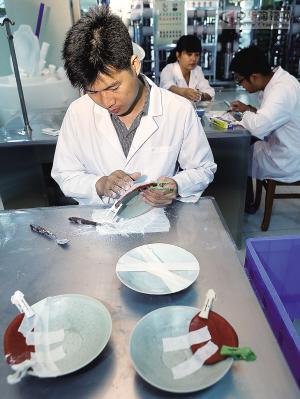 6月5日,海南省博物館出水文物保護(hù)修復(fù)實(shí)驗(yàn)室內(nèi),科研人員在修復(fù)華光礁出水的瓷碗。