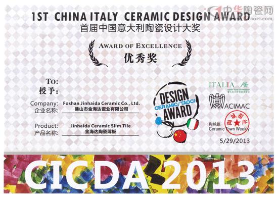 2013年5月29日,在佛山新媒體產(chǎn)業(yè)園首屆“中國(guó)意大利陶瓷設(shè)計(jì)大賽”頒獎(jiǎng)禮現(xiàn)場(chǎng),金海達(dá)薄板憑借“北歐楓情”系列產(chǎn)品作為薄板界唯一代表榮獲設(shè)計(jì)大獎(jiǎng)。此次獎(jiǎng)項(xiàng)的評(píng)比,完全嚴(yán)格參照意大利的相關(guān)標(biāo)準(zhǔn),對(duì)參選公司的技術(shù)水平、設(shè)計(jì)實(shí)力進(jìn)行客觀公正嚴(yán)謹(jǐn)?shù)乜荚u(píng),旨在選出設(shè)計(jì)概念與產(chǎn)品品質(zhì)最杰出的中國(guó)瓷磚產(chǎn)品。