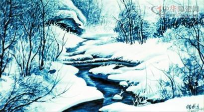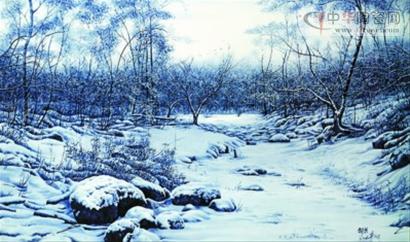 《薄霧余光》,那是一幅冬天的森林景色,白雪皚皚,鋪滿大地,也掛滿了枝頭。樹(shù)葉凋零了,枝干仍然挺拔,大雪壓不倒,傲立風(fēng)雪中,那種滄桑感躍然“紙上”。作者力圖用冷艷來(lái)詮釋意境,因此,在色彩上,用白色的雪和青色的枝干交相輝映,斑斑駁駁,或?qū)哟畏置,或朦朦朧朧,《薄霧余光》,引人入勝。