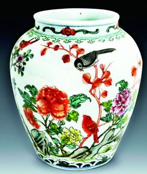 這個(gè)明代五彩花鳥紋瓷罐,高25厘米,罐腹四面以不同的花鳥題材構(gòu)成裝飾主題,畫中各式花卉競相綻放,姹紫嫣紅,淡淡的花香吸引著鳥兒棲身花枝上。整個(gè)畫面給人感覺出濃濃春意撲面而來,一派春意盎然的自然景象。