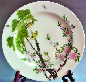 粉彩瓷又叫軟彩瓷,景德鎮(zhèn)窯四大傳統(tǒng)名瓷之一。粉彩是一種釉上彩繪經(jīng)低溫?zé)傻牟世L方法。粉彩瓷器是清康熙晚期在五彩瓷基礎(chǔ)上,受琺瑯彩瓷制作工藝的影響而創(chuàng)造的一種釉上彩新品種。這件民國粉彩柳樹黃鶯盤,直徑25.2厘米,上繪柳樹黃鶯圖。粗壯的柳樹,纖細(xì)的桃枝,柳樹枝葉茂盛,桃枝花朵綻放,兩只黃鶯立在柳樹枝頭朝遠(yuǎn)方鳴叫,像是在歡呼春天的到來。不遠(yuǎn)處蝴蝶翩翩飛舞,讓人感到了春意濃濃,心曠神怡。此盤瓷質(zhì)潔白細(xì)膩,造型舒展大方。