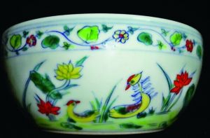 青花斗彩是以釉下青花作為一種色青而與釉上多種色彩相結(jié)合的瓷器裝飾技法。“斗”是景德鎮(zhèn)方言,意思是幾種東西合并組合在一起。斗彩就是把幾種色彩組合在一起的技法。斗彩是一種釉上、釉下都有彩的彩色瓷。這個(gè)青花斗彩鴨子瓷碗,高7.5厘米,口徑17.5厘米,底徑10厘米。外壁青花斗彩繪有鴨子戲水圖,紅花綠葉,分外妖嬈。兩只彩鴨,在水中歡快地追逐嬉戲,盡情享受春天愜意的生活,在花卉和水草的襯托下,呈現(xiàn)出一派悠閑自得的春日美妙圖景。