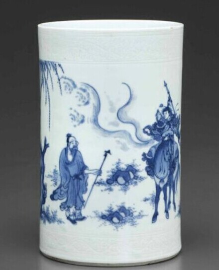 筆筒直腹,口和足的外沿暗刻紋飾,器身通景繪青花人物故事圖。一人騎馬馳至,與持拐老者交談。青花濃淡有致,色澤明快,繪畫細(xì)膩,人物刻畫生動(dòng)、布局合理,胎質(zhì)細(xì)膩。應(yīng)為一件不可多得之文房佳品。在翰墨飄香的中國傳統(tǒng)文化中,除了筆、墨、紙、硯文房“四寶”之外,還包括了很多的輔助文具,筆筒就是其中的一種。從明代起,制作精致的筆筒就成為文人雅士和收藏家的寵物。
