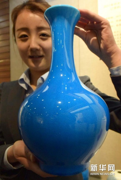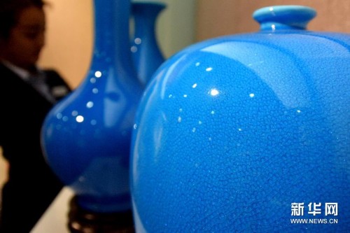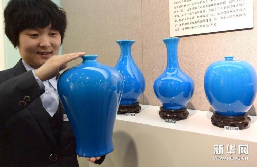 3月23日,工作人員在展示“魚子藍”釉瓷器。