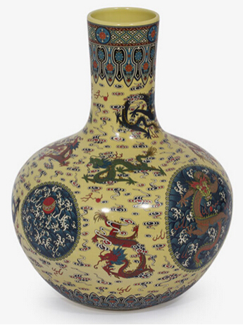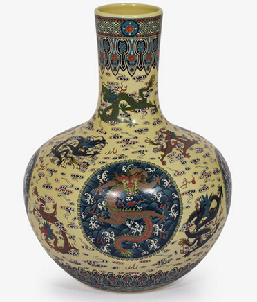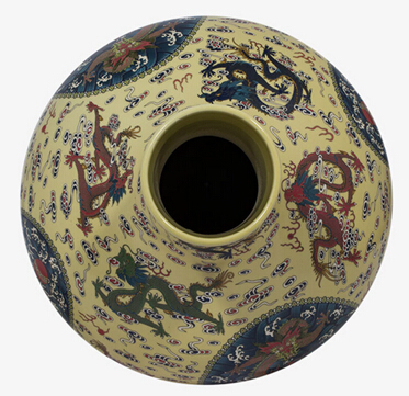 深圳鑫寶源提供的此件藏品,雍正款黃地粉彩龍紋天球瓶,圓口,頸部粗短,上闊下斂,球形腹碩大,砂底微凹。外口頸部布滿紋飾,腹部裝飾有云龍紋,云龍回首觀望,張口怒齒吐舌,奮爪騰飛,遒勁威武,一展叱咤風(fēng)云之態(tài)。鼻吻向上外翻,下顎胡須向后飛揚(yáng),兩鹿角壓低貼近向后飛揚(yáng)的數(shù)屢鬃鬢,神采奕奕,惟妙惟肖,鱗片描繪精細(xì),片片單獨(dú)暈染;顏色絢麗,濃淡相宜; 筆法細(xì)致,極為流暢,畫(huà)面生動(dòng)傳神,氣勢(shì)恢宏,一派皇家之勢(shì)。龍紋為中國(guó)傳統(tǒng)的吉祥紋飾,龍又進(jìn)一步演變成至尊的王權(quán)。腹部龍紋大氣磅礴,威猛雄壯,叱咤 風(fēng)云,是雄心勃勃要干一番大事業(yè)的皇帝的象征。存世極為罕見(jiàn),公私典藏不過(guò)數(shù)例,極具收藏價(jià)值。