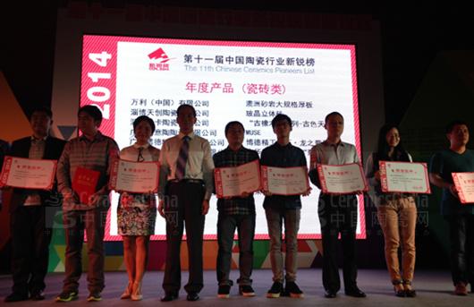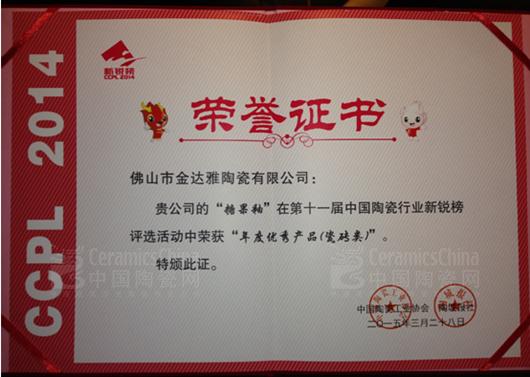 2015年3月28日,第十一屆中國(guó)陶瓷行業(yè)新銳榜頒獎(jiǎng)典禮暨中國(guó)制造•佛山論壇在佛山新媒體產(chǎn)業(yè)園隆重舉行。金達(dá)雅陶瓷原創(chuàng)糖果釉瓷磚憑其全新技術(shù),閃亮肌理喜獲“年度優(yōu)秀產(chǎn)品(瓷磚類)”大獎(jiǎng),成為中國(guó)陶瓷行業(yè)2015年陶瓷新品中亮眼之星。