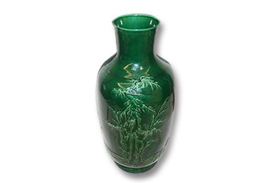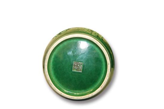 藏品王炳榮款綠釉賞瓶通體施綠釉,釉質(zhì)晶瑩,造型古樸穩(wěn)重,渾厚大器?雌渚G色,綠色青翠,綠中泛藍(lán),如孔雀羽毛,又如綠松石之綠藍(lán),非常鮮亮,極其美麗。藏品彌足珍貴,如此精作大件的綠釉瓷器保存至今完好無缺,可謂寶中之寶也。