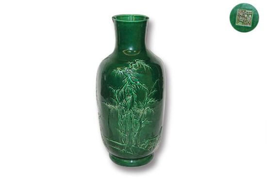 本公司最近有幸征集到一款瓷器珍品“王炳榮款綠釉賞瓶”,藏品高:46cm,底徑:14cm,口徑:11cm。整體施綠釉,瓶身上用瓷雕的方法描繪了一幅智者在樹之下沉思的景象。底部正中有圖章款一方,印文篆書陽刻,外加方形圈,款識為“王炳榮作”四字。器物頗具晚清時代特征,精致秀美,畫面生動自然,技法多種并用,色彩明快淡雅,有較強的寫實性和較高的藝術(shù)性,是一件不曾多見的瓷器藝術(shù)品。