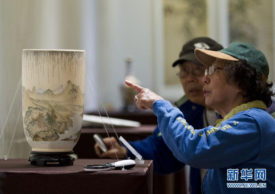 4月28日,觀眾在加拿大多倫多中華文化中心參觀“陶瓷微書(shū)”作品。作為2015-2016中國(guó)與加拿大文化交流年的一項(xiàng)內(nèi)容,中國(guó)國(guó)家級(jí)非物質(zhì)文化遺產(chǎn)——“陶瓷微書(shū)”作品展于4月24日至5月1日在加拿大多倫多舉行,展覽展出了項(xiàng)目傳承人王芝文的數(shù)十件作品。“陶瓷微書(shū)”將中國(guó)書(shū)法藝術(shù)與陶瓷藝術(shù)相結(jié)合,在不用任何放大設(shè)備的情況下,運(yùn)用難度極高的微小文字在瓷器上創(chuàng)作。新華社發(fā)(鄒崢攝)