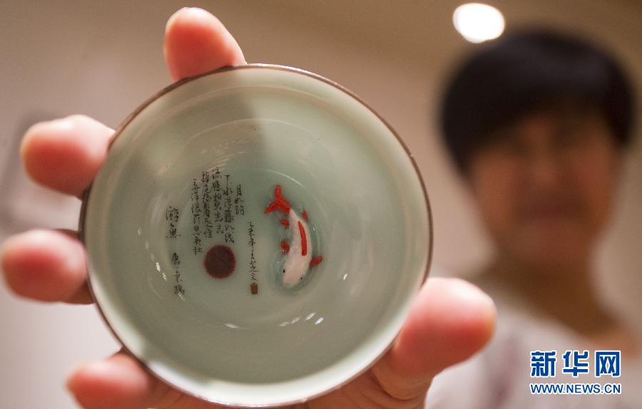 這是4月28日在加拿大多倫多中華文化中心拍攝的一件“陶瓷微書(shū)”作品。作為2015-2016中國(guó)與加拿大文化交流年的一項(xiàng)內(nèi)容,中國(guó)國(guó)家級(jí)非物質(zhì)文化遺產(chǎn)——“陶瓷微書(shū)”作品展于4月24日至5月1日在加拿大多倫多舉行,展覽展出了項(xiàng)目傳承人王芝文的數(shù)十件作品。“陶瓷微書(shū)”將中國(guó)書(shū)法藝術(shù)與陶瓷藝術(shù)相結(jié)合,在不用任何放大設(shè)備的情況下,運(yùn)用難度極高的微小文字在瓷器上創(chuàng)作。新華社發(fā)(鄒崢攝)