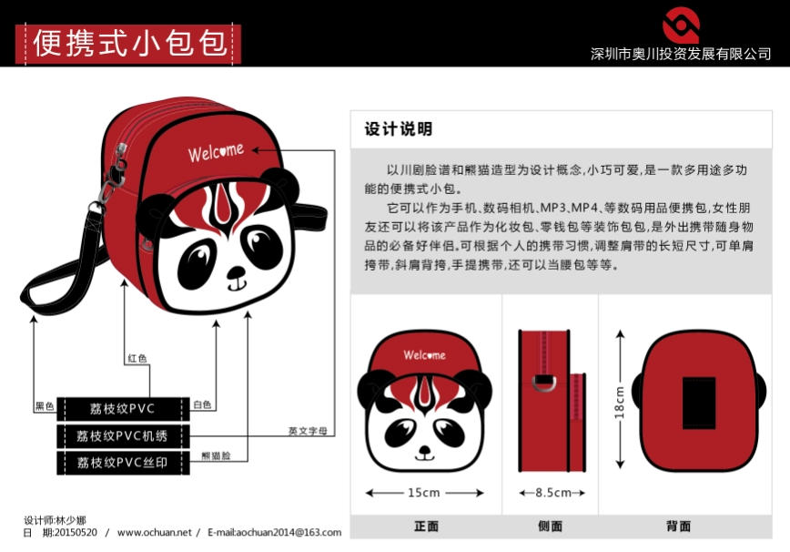 來自創(chuàng)客之都的深圳奧川投資有限公司則把自己最拿手的箱包系列融入到成都禮物當(dāng)中。他們的的市場總監(jiān)李藍(lán)在先后走訪錦里、寬窄巷子等多個旅游商品的集散地后,將公司的主打產(chǎn)品收納包系列融入了熊貓?jiān)。熊貓是四川的名片,也是成都的吉祥物。小巧的收納,融合著熊貓憨態(tài)可掬的圖案,勢必會引領(lǐng)新一股從熊貓而來的潮流。