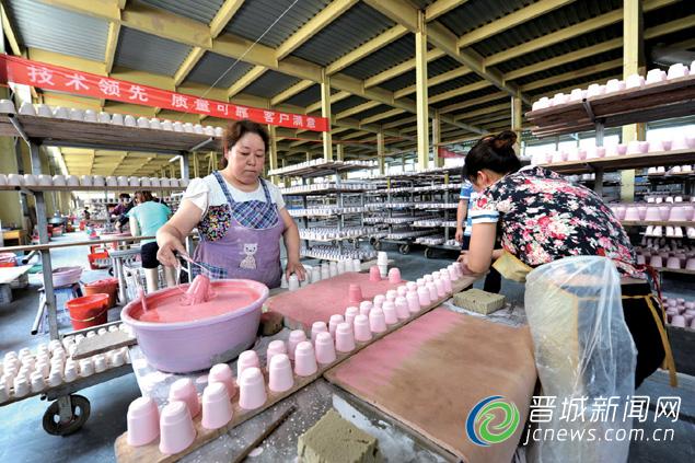 在晉陶陶瓷有限公司生產(chǎn)車間,員工正在給酒盅上釉。 本報記者 張文庭 攝