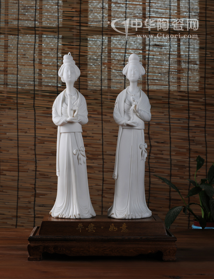 簡介:第四屆福建省陶瓷藝術(shù)設(shè)計(jì)創(chuàng)新評比金獎(jiǎng),兩仕女一個(gè)手持如意,一個(gè)手持玉瓶,巧妙運(yùn)用諧音,寓意平安如意。作品刻畫細(xì)致,對五官、衣物的細(xì)節(jié)把握得恰到好處。