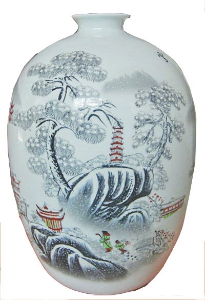 山間看“江山瑞雪”。圖三是一只民國時(shí)期的粉彩冬瓜罐,敞口,短頸,豐肩,束腹,圈足,因形似冬瓜而得名。罐高32.5厘米,口徑4.5厘米,底徑8.7厘米,罐上展現(xiàn)的正是“江山瑞雪”圖,只見莽莽蒼蒼的山間,有紅色亭臺(tái),七層高塔,有連在江上的回廊,山上青松蒼翠,紛紛瑞雪,飄落山間,一片潔白。一位頭戴斗笠的隱士,正在山間路上,仰首遠(yuǎn)眺,江山如畫,大地蒼茫。他身后的小童扛著一株紅梅,正隨他向前走。邊上有題款“江山瑞雪”,“辛巳年宜民作于景德鎮(zhèn)”。