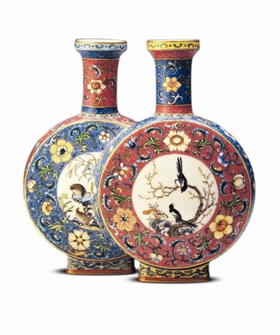 清乾隆粉彩開光花鳥雙連瓶,高20厘米,最寬8.2厘米,口徑4.2厘米。瓶作扁圓形,為凸顯別出新裁的造型,兩只扁圓瓶以前后錯(cuò)開但腹部相連的形制出現(xiàn)?谧鞔竭呄騼(nèi)斂收,短頸、長(zhǎng)方形矮足,胎骨厚重,瓶面滿飾藍(lán)、紫錦地圖案,錦地之上再彩畫各式纏枝花卉。雙連瓶腹部中心兩面開光,分畫梅花、喜鵲及水仙、鵪鶉,由于兩器相連,故前后兩面的開光,皆因交錯(cuò)之故而各出現(xiàn)圓形與半圓形的作法,此變化亦與藍(lán)、紫兩色釉彩的交叉出現(xiàn)共同形成有趣的對(duì)應(yīng)與變化。器內(nèi)及底皆施湖綠色釉,底以青花書“大清乾隆年制”六字篆款。雙連瓶的形制,已見于乾隆之前的官窯和民窯。乾隆官窯為表現(xiàn)其卓越的承造能力,故于前人的基礎(chǔ)上盡力燒造“雙管瓶”、“三級(jí)瓶”、“四喜瓶”、“五岳瓶”、“六孔瓶”和“七孔花插”等,全面展現(xiàn)技術(shù)與想象。