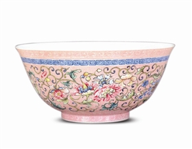 清乾隆粉紅錦地番蓮?fù)耄?.6厘米,口徑15.9厘米。此碗侈口、深弧壁、矮圈足,外壁施淺粉紅色底釉,其上再錐劃蔓草及回紋。粉紅釉彩之上,又以各色彩料畫出纏枝番蓮花,近口緣加飾一圈藍(lán)料回紋,碗心彩畫秋葵花一簇,器底以藍(lán)料書“乾隆年制”四字楷款。整件作品壁薄如紙,繁花似錦,敷彩淡雅,線條清晰,不失為乾隆官窯代表作。乾隆官窯善于制作繁密瓷繪,如粉彩花卉瓶極致地表現(xiàn)出琳瑯滿目的花朵。相對(duì)于粉彩花卉瓶,此件作品更為考究,淺粉紅底釉遠(yuǎn)看似一層薄的素色底釉,近觀才發(fā)現(xiàn)釉面已先以針狀工具逐次剔除底釉,營(yíng)造出錦地紋。再于織錦的底紋上彩畫各種花卉,表現(xiàn)出錦上添花的多層次裝飾風(fēng)格。依據(jù)造辦處檔案的記載,御窯廠曾燒造綠地、黃地、白地、紅地、月白地“錦上添花”的瓷胎琺瑯,可見錦上添花紋飾流行于乾隆朝的情形。