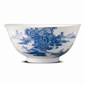 清雍正琺瑯彩山水碗,高6.9厘米,口徑14.9厘米。相對(duì)于康熙時(shí)期的琺瑯彩瓷,雍正官窯的作品,逐漸往視器面如同畫面的方向發(fā)展,此時(shí)彩色底釉漸為白釉所取代,畫琺瑯人仿佛在素白的紙或絹上作畫,無論是由宮廷畫家親自執(zhí)筆畫圖,或者只是提供畫稿讓畫匠來依稿繪制,在追模文人書畫雅趣的訴求下,琺瑯彩瓷的圖繪愈發(fā)精致細(xì)膩,完全以比照院畫水平為能事。此品侈口窄唇,弧形深壁,矮圈足。薄胎白釉,弧形碗壁一面彩畫藍(lán)料山水,畫中山崖石壁上由細(xì)筆描繪出來的線條,為表現(xiàn)陰陽(yáng)向背所暈染出來濃淡色澤,與凝聚于山頭的苔點(diǎn),以及溪旁的林樹、舟渚、茅屋等無不精細(xì)入微,大有提供觀賞游覽之功能。另一面以墨書題寫:“一江綠水浮嵐影,兩岸青山夾翠濤”,題句前后并以紅料描畫“壽如”、“山高”、“水長(zhǎng)”三印。底素白,中心以藍(lán)料書“雍正年制”四字宋體款。