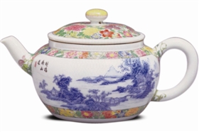 清雍正琺瑯彩藍(lán)料山水把壺,高9.2厘米,口徑7.5厘米。寬圓直口,壺身較低呈短圓身,曲把,管形流,平底凹足,帶平頂寶珠形蓋,鈕側(cè)一氣孔。壺腹部?jī)擅骈_光,各畫不同的藍(lán)料山水圖畫。一面有墨書題“樹接南山近”,下描紅“山高”一印。另一面題“煙含北渚遙”,下亦有紅料描繪“水長(zhǎng)”一印。隙地及蓋面彩繪四季花卉紋的錦地花紋飾。胎薄透光,質(zhì)地細(xì)膩,山水畫工精美,釉彩富麗脫俗。壺底藍(lán)料書“雍正年制”二行四字仿宋體款字,外加雙方框。雍正御用茶壺,喜愛簡(jiǎn)約大方造型,此類壺身較短,壺口略大的茶壺為雍正時(shí)期仿宜興壺形制而作,單色釉如霽青、茶葉末琺瑯彩瓷茶壺,均為相同造型。本件在道光十五年《琺瑯、玻璃、宜興、磁胎陳設(shè)檔案》內(nèi)記載名為“雍正磁胎畫琺瑯青山水白地茶壺,一件”。