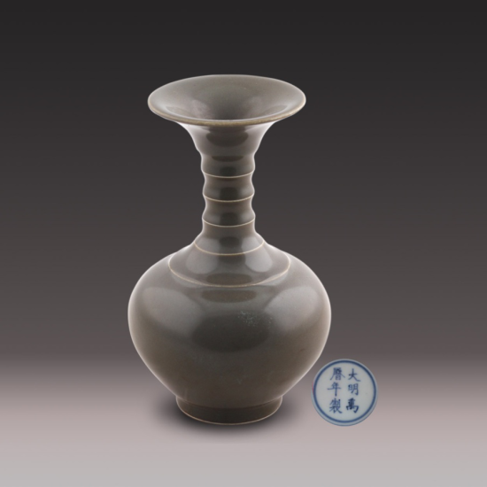 瓶撇口,長(zhǎng)頸,鼓腹,造型優(yōu)美,線條優(yōu)雅,頸部與肩部都以旋紋來裝飾,有層次感。此瓶形制端莊,通體施茶葉末釉,釉面發(fā)色沉穩(wěn),有高雅文士的氣質(zhì),美感獨(dú)特?钭R(shí)是“大明萬(wàn)歷年制”六個(gè)正楷大字,該藏品具有較高的收藏價(jià)值。