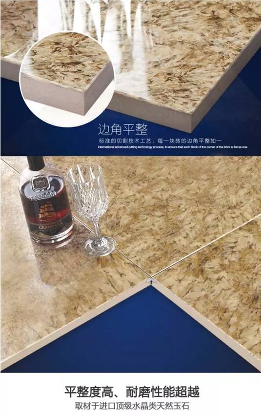 4、珍材實(shí)料,更厚重。整磚厚度為14.3-14.5mm、表面微晶玻璃層厚度為2.3-3.0mm,比一般微晶石分別高出0.5-1mm;全磚整重43-45斤,比其他同規(guī)格瓷磚產(chǎn)品重20斤。