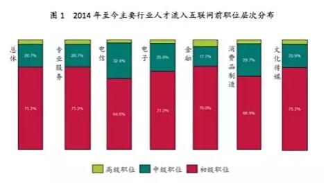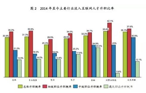 報告指出,專業(yè)服務業(yè)、電信業(yè)、電子業(yè)、金融業(yè)、消費品制造業(yè)和文化傳媒業(yè)從業(yè)人員是流入互聯(lián)網(wǎng)最多的六大群體,職場新人不僅轉行互聯(lián)網(wǎng)的人數(shù)最多,升職空間也最大;高學歷能夠增加升職優(yōu)勢;行業(yè)資深人士往往以成熟的管理能力和開闊的視野在跳槽后獲得升職。
