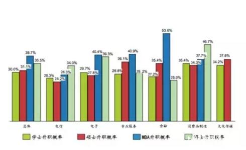 數(shù)據(jù)顯示,在互聯(lián)網(wǎng)行業(yè),學歷和升職概率呈正比,擁有MBA和博士學歷的跳槽者晉升機會最多,碩士生則比本科生更有晉升優(yōu)勢。