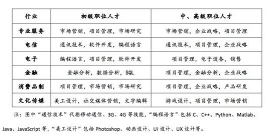 就各個人才群體的升職所需技能而言,初級職位人才大多依靠“老本行”獲得晉升,例如專業(yè)服務行業(yè)的營銷能力、電子行業(yè)的編程能力、金融行業(yè)的金融分析能力、文化傳媒行業(yè)的文字編輯能力等。