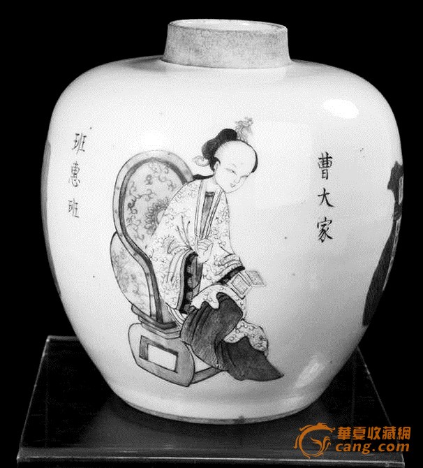 清代無雙譜人物罐班昭,瓷色潔白,光亮細(xì)膩。班昭一身素凈的衣裳,西瓜紅長裙,坐在一張印花的靠椅上,手里捧著一本書,表情寧靜平和。圖案的左邊寫著“班惠班”,右邊寫著“曹大家”。漢朝的班昭,字惠班,是我國歷史上第一個(gè)女史學(xué)家,同時(shí)也是一個(gè)博學(xué)多才的文學(xué)家,在其兄班固死后,奉旨入宮續(xù)寫《漢書》并得到漢和帝的賞識(shí),成為皇后和貴人們的老師,號(hào)稱“大家”,因其丈夫姓曹,故后世亦稱“曹大家”。