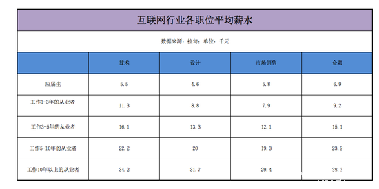 小編整理了一份數(shù)據(jù),從多個緯度整理了互聯(lián)網(wǎng)行業(yè)的薪資水平。依據(jù)不同的工作年限,在技術(shù)、設(shè)計、市場銷售、金融這四個領(lǐng)域,2015年這些職位平均的月薪分別為: