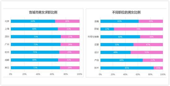 女性求職者的比例,依然要遠低于男性。從地域緯度看,北京地區(qū)女性求職者占比最高,男女求職比例達到 64:36。上海男女求職比例為 68:32,深圳為 73:27,廣州男女求職比例為 72 : 28。