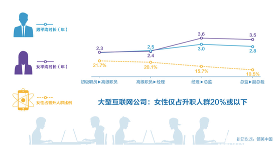 此外,女性在升職過程中,遇到的障礙也會高于男性。Linkedin 領(lǐng)英告訴 36 氪,在大型互聯(lián)網(wǎng)公司中,男性占中低層升職人群的 80%,中層向上占比逐級上升。在工程師崗位上,女性升職難現(xiàn)象較為明顯。男工程師自經(jīng)理升任總監(jiān)平均需花 2.4年,而女工程師則需花 5.5年 能升任總監(jiān),男工程師升職時間僅為女工程師的一半。