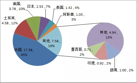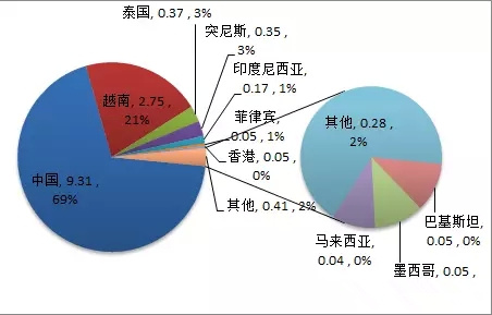 歐盟進(jìn)口工藝陶瓷金額來源分布(單位:億美元)
