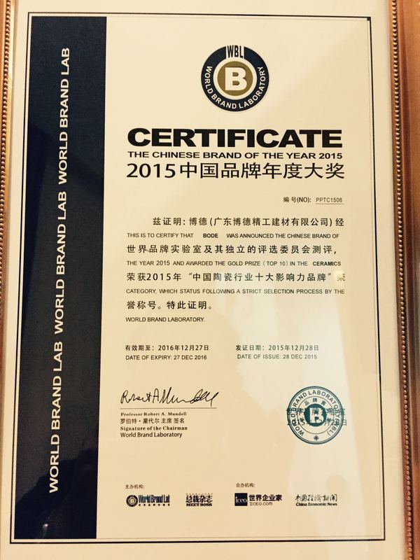 2015年12月28日,由世界品牌實(shí)驗(yàn)室(World Brand Lab)主辦的“中國(guó)品牌年度大獎(jiǎng)”發(fā)布會(huì)在北京隆重舉行,廣東博德精工建材有限公司旗下的高端品牌“博德”榮摘“中國(guó)品牌年度大獎(jiǎng)——中國(guó)陶瓷行業(yè)十大影響力品牌”。哈佛大學(xué)商學(xué)院教授約翰·戴騰博士、耶魯大學(xué)管理學(xué)院教授萊維·多爾博士出席了會(huì)議并為獲獎(jiǎng)?wù)哳C發(fā)獎(jiǎng)牌。