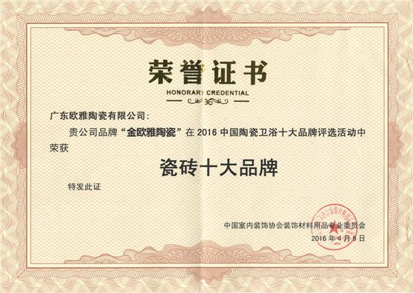 金歐雅陶瓷榮獲瓷磚十大品牌稱號