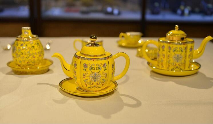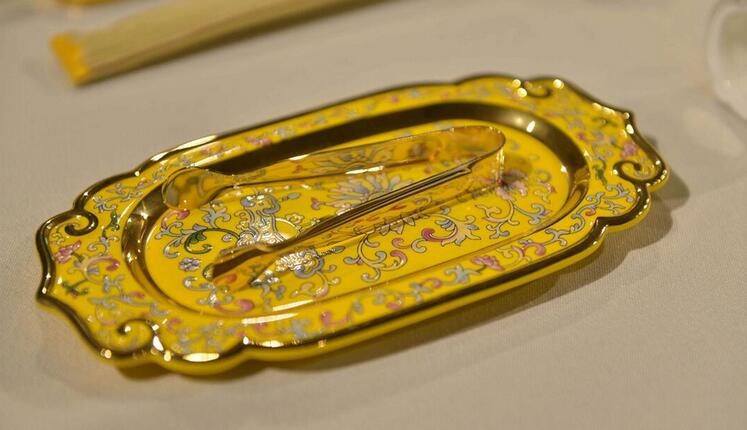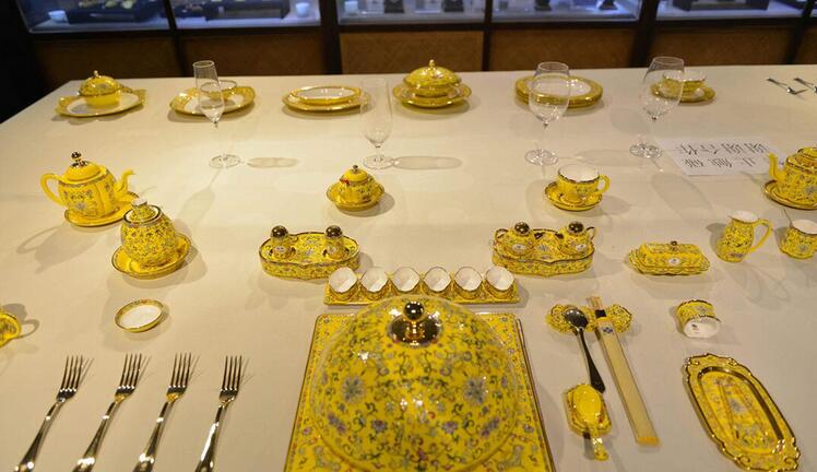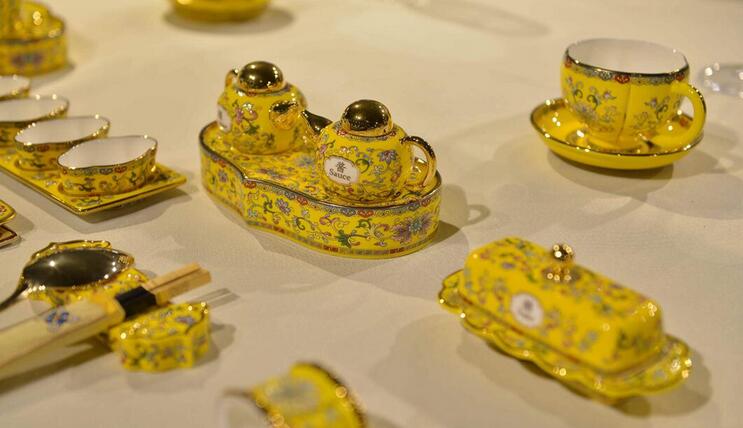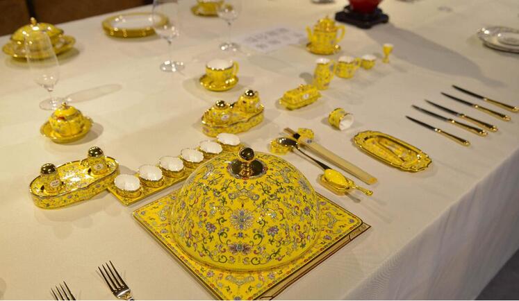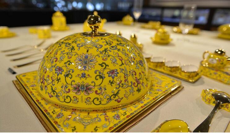 2016年6月15日,遼寧省沈陽市,在2014年APEC中國峰會國宴上使用的餐具“帝王黃”68件套亮相沈陽,琺瑯彩瓷售價98000元。