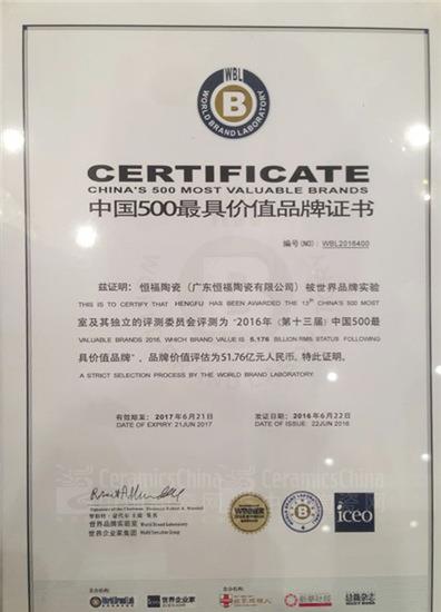 品牌價值達51.76億元,恒福陶瓷連續(xù)三年榮獲“中國500最具價值品牌”殊榮
