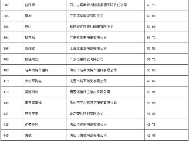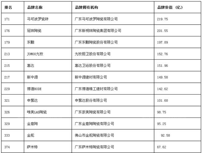 剛剛出爐的2016年(第十三屆)“中國(guó)500最具價(jià)值品牌”排行榜,共有來(lái)自食品飲料、紡織服裝、文化傳媒、信息技術(shù)、家用電器等在內(nèi)的23個(gè)相關(guān)行業(yè)的品牌入選。其中建材行業(yè)42個(gè)品牌上榜,含22個(gè)陶瓷品牌和3個(gè)衛(wèi)浴品牌,且大多數(shù)已不是第一次上榜。