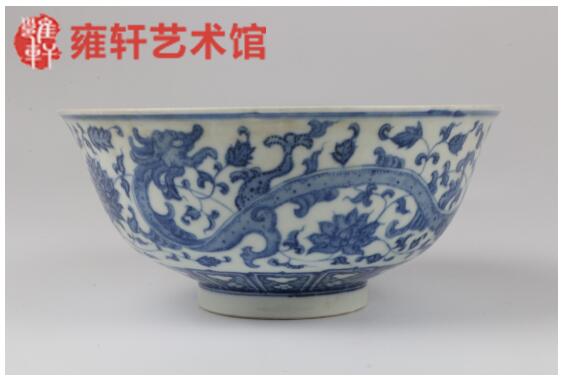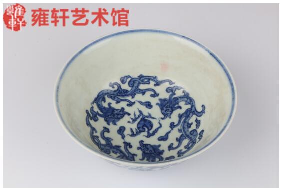 雍軒藝術(shù)館最近有幸征集到一款大清光緒款“青花纏枝花卉龍紋碗”,藏品高:8.5cm,口徑:20cm。藏品通體飾以青花,胎土精細(xì),釉汁均凈,造型工整,凝重渾厚,胎質(zhì)細(xì)膩,細(xì)砂底,整體風(fēng)格是雄偉渾厚,莊重古樸。裝飾手法豐富,繪畫講究恢宏壯闊,具有很強(qiáng)的藝術(shù)感染力。碗身上纏枝花卉描繪得非常流暢,線條粗獷,自由活潑,畫法布局根據(jù)器型講究變化,青花云龍紋畫工展現(xiàn)夔龍靈活多變又有靈氣的規(guī)律性,顯示了當(dāng)時裝飾藝術(shù)的高超及繪畫功力的嫻熟。