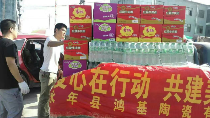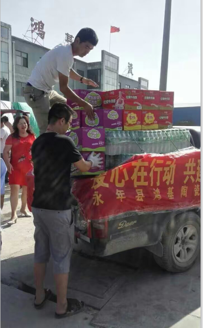 天災(zāi)無情,人間有愛。位于河北省永年縣的河北鴻基陶瓷有限公司董事長黃國汀、夏惠鳳、董行樹等公司高層對(duì)這次受災(zāi)高度重視,每天派人在各區(qū)和村及時(shí)的不停給當(dāng)?shù)貫?zāi)民送溫暖,把大米、油、方便面、火腿腸、消毒液等急需物質(zhì)及時(shí)送到災(zāi)民身邊。