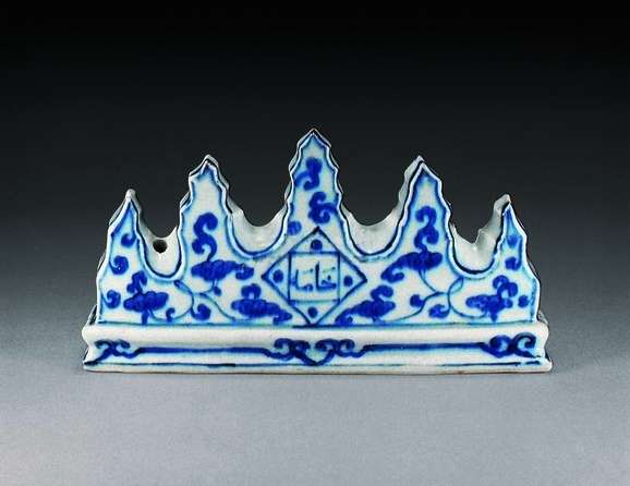 明代瓷制筆架以山形居多,有明確紀(jì)年的為正德時(shí)青花筆架,如青花纏枝靈芝阿拉伯文筆架,以雕塑技術(shù)成型,為五峰山狀,中峰略高,兩側(cè)山峰漸次。五峰以青花勾勒邊線,內(nèi)繪纏枝靈芝紋飾,中峰開光內(nèi)書有波斯文字。五峰山下為青花勾云紋。底有青花“大明正德年制”楷款。