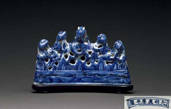 筆架也由最初的石質(zhì)發(fā)展為瓷質(zhì)。山形筆架為明代主流,峰數(shù)一般不過五峰。故宮藏明萬歷青花三龍紋筆架呈“山”字形,高10.1厘米,底徑15.5厘米。塑三條立行龍,中間正面龍怒目伸爪,兩側(cè)龍昂首呼應(yīng)。基座為海水江崖紋,下呈彎月狀足。底長(zhǎng)方框內(nèi)青花橫書“大明萬歷年制”六字楷書款。三龍紋筆架為萬歷官窯創(chuàng)新之作。