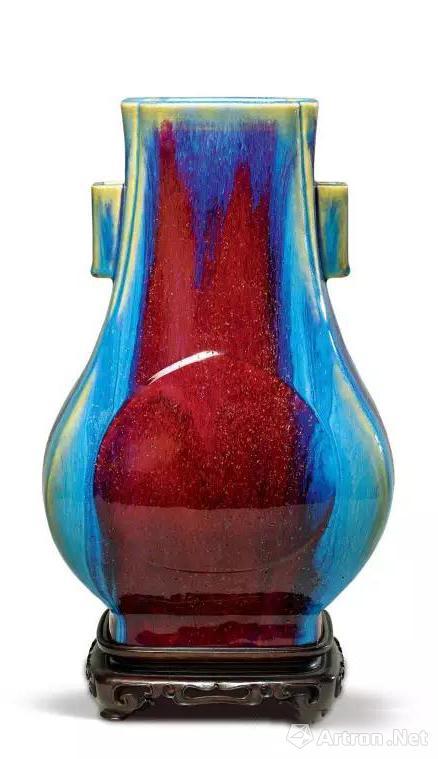 窯變釉是一種以銅紅釉為主,并添加多種金屬元素?zé)贫傻母邷赜,為雍正后期唐英督窯時所創(chuàng),自乾隆至清代晚期均有燒造。本品通體施窯變釉,釉色明潤,燦如云霞。扁方形瓶體,四角倭收,直口,長頸溜肩,頸部兩側(cè)各飾有一方形管狀貫耳,下腹略鼓,腹部前后有突起桃形紋樣,《江西通志》載同治三年大運傳辦瓷器清單中,有“均釉四方杏元雙管瓶”一種,即此品種的正式名稱和燒造時間,原為清早期即有的官窯式樣,清代后期仍延續(xù)燒造。