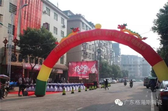 9月24日,萬里晴空,艷陽高照,在湖南嘉禾大市場通往格萊斯陶瓷旗艦店的道路上,若干個碩大的充氣拱門橫跨馬路,道路上是川流不息的汽車和行人。原來,今天是嘉禾格萊斯陶瓷旗艦店的周年落地慶典,同時也是“格命風暴”2016格萊斯陶瓷全國聯(lián)動(嘉禾站)圓滿落地的大好日子。