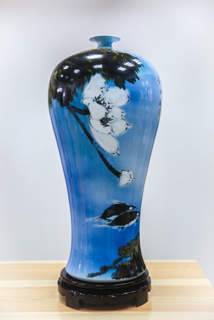 徐美蘭在本次展覽展出的代表作品中。其中蓮塘秋水為顏色釉瓷蓮子瓶,為景德鎮(zhèn)四大名瓷。蓮塘秋水造型典雅,線條流暢,極富質(zhì)感。作品以天藍(lán)色為底色,黑色勾勒輪廓,白色繪成蓮花作點(diǎn)晴之筆。整個(gè)作品釉彩飽滿,張力十足,筆法細(xì)膩,極富想象力,藍(lán)色與黑色的大膽結(jié)合,形成反差美感,將秋水、蓮花躍然于瓶上,賦予陶瓷全新生命力,作品讓人過目不忘。