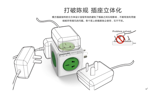隨著手頭不斷增加著的電子設備,我們經(jīng)常被各種插頭在插排上“打架”的現(xiàn)象困擾——尺寸不一的充電器無法共存,不能有效利用插座接口。PowerCube(模方插座)的出現(xiàn)就像是插座界的一陣清風,顛覆傳統(tǒng)排插的外觀設計,它的每一面都可以被充分利用,避免了傳統(tǒng)排插插頭間互相打架的尷尬局面,為插座界帶來了一種全新的洪荒之力。該產(chǎn)品2014年獲得德國紅點設計獎,其設計公司阿樂樂可工業(yè)設計有限公司,是一群由荷蘭代爾伏特理工大學工業(yè)設計畢業(yè)生們成立的創(chuàng)意設計公司,以模方插座的設計產(chǎn)品風靡全球。