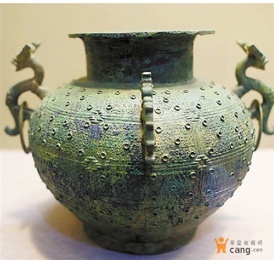 “勾敔夫人墓”于上世紀(jì)70年代后期發(fā)掘于河南與安徽交界處的固始縣,其中出土的3件車輿(古代轎子)在當(dāng)時是首次發(fā)現(xiàn),保存完整,結(jié)構(gòu)復(fù)雜。“勾敔夫人”是宋景公的妹妹,這位來自北方的公主嫁給了吳國國君。本次展出的展品包括9件成組的列鼎、9件一組懸掛的編鐘,三足帶蓋壺、乳丁紋盒、提梁盉、青銅勺等。其中一件鑲嵌紅銅的方形青銅豆(古代盛放食物或醬料的器皿),工藝甚是精美,紅銅鑲嵌進(jìn)青銅器上,并打磨平整,用紅銅裝飾的小龍在青銅豆上栩栩如生。