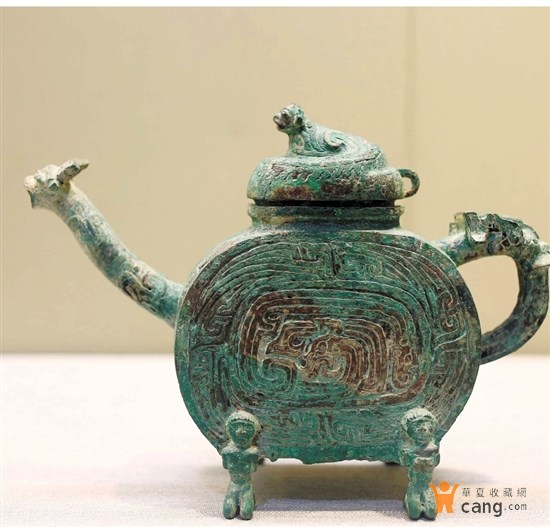 再看出土于河南泌陽的春秋昶仲匜和蟠龍紋青銅盤,這是一組兩件的精美青銅盥洗器,為一級文物。兩周時期的貴族生活較為高雅,在日常生活中為了體現(xiàn)自己的身份和地位使用青銅器。匜內(nèi)盛有水,為注水器,貴族洗手時,侍者將水倒在貴族的手上,下面的圓盤是盛接水的器物。從這件盥洗青銅器上可見當(dāng)時貴族生活的高雅和“沃盥之禮”。