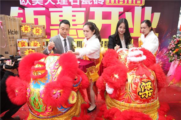 歐雅企業(yè)工程事業(yè)中心總經(jīng)理嬈良文、三水歐美陶瓷旗艦店董事長潘秋萍共同為瑞獅點(diǎn)睛