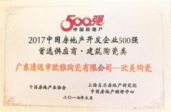 恭喜歐美陶瓷再度榮膺“2017中國房地產(chǎn)開發(fā)企業(yè)500強首選供應商”稱號