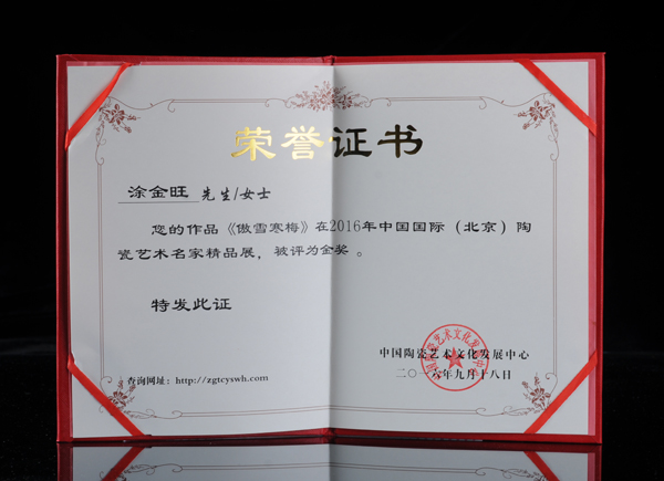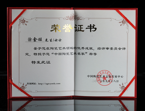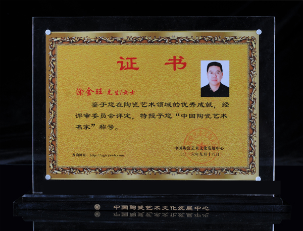 2016年9月,鑒于涂金旺在陶瓷藝術(shù)領(lǐng)域取得的突出成就,經(jīng)中國陶瓷藝術(shù)文化發(fā)展中心評審委員會評定授予涂金旺“中國陶瓷藝術(shù)名家”稱號